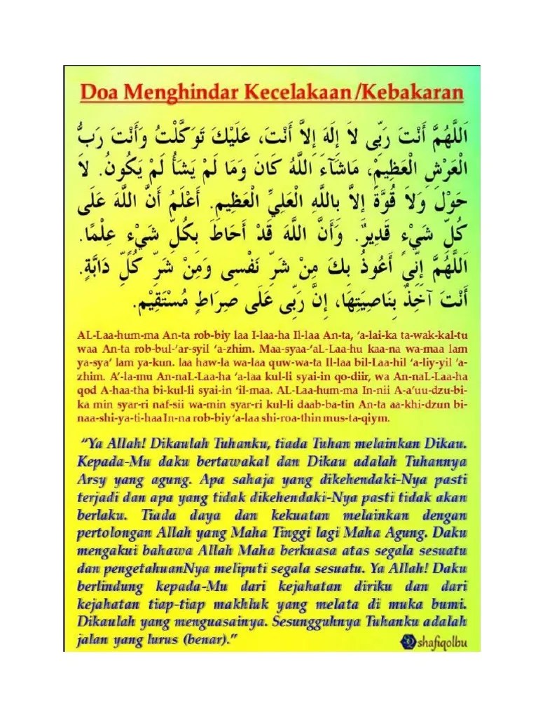Di bawah ni adalah doa abu darda untuk perlindungan dan baik dibaca dan dibuat amalan. Penghalang benteng santau nasihat bidara mausidrah solution hq facebook. doa pelindung diri rumi untuk amalan akal cerdas. Terjemahan maksud:"ya allah, engkaulah tuhanku, tiada tuhan bagiku kecuali hanya engkau. Boleh google berkenaan kisah abu darda ini dan doa ini disarankan di dalam program tanyalah ustaz di tv 9 supaya diamalkan untuk dibaca tiga kali (3x) selepas solat subuh, dan tiga kali (3x) selepas solat asar. Dan doa yang diajarkan kepada beliau oleh rasulullah s.a.w. doa ini telah diajarkan kepada beliau oleh. "ya allah, engkaulah tuhanku, tiada tuhan bagiku kecuali hanya engkau. Maka allah akan menyembuhkannya dari penyakitnya itu. Datang orang ketiga mengatakan hal serupa. Sunan baihaqi, bab shalat istisqa' A adam, nabi, abu darda', abu daud, abu hurairah, abu sa'id alkhudri, abu umamah, adam a.s., nabi, ahmad, aisyah, 'amr ibn syu'aib, anas ibn malik. abu darda` menjawab, "saya yakin bahawa allah tidak akan membakar rumah saya.